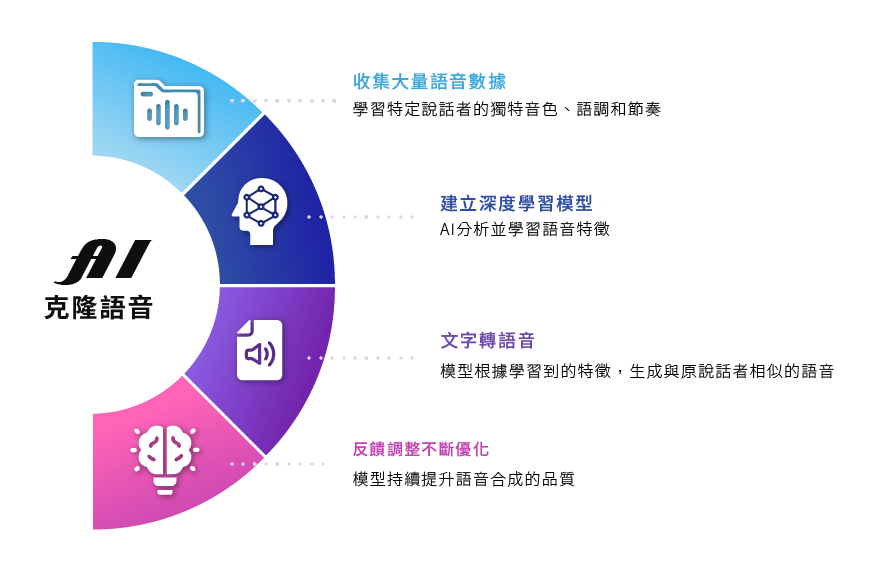 AI克隆語音的運作主要依賴於深度學習技術,系統需要大量的語音數據作為訓練資料,這些數據用來學習特定說話者的語音特徵,如音色、語調和節奏。接下來,AI模型會使用這些數據進行訓練,學習如何模仿這些特徵,當有新的文字輸入時,例如:文字敘述、一篇文章或一句話,訓練好的模型可以根據之前學到的語音特徵生成一段新的語音,聽起來就像是特定說話者在講話。整個過程會不斷透過反饋和調整,來提升語音合成的精確度和自然度。