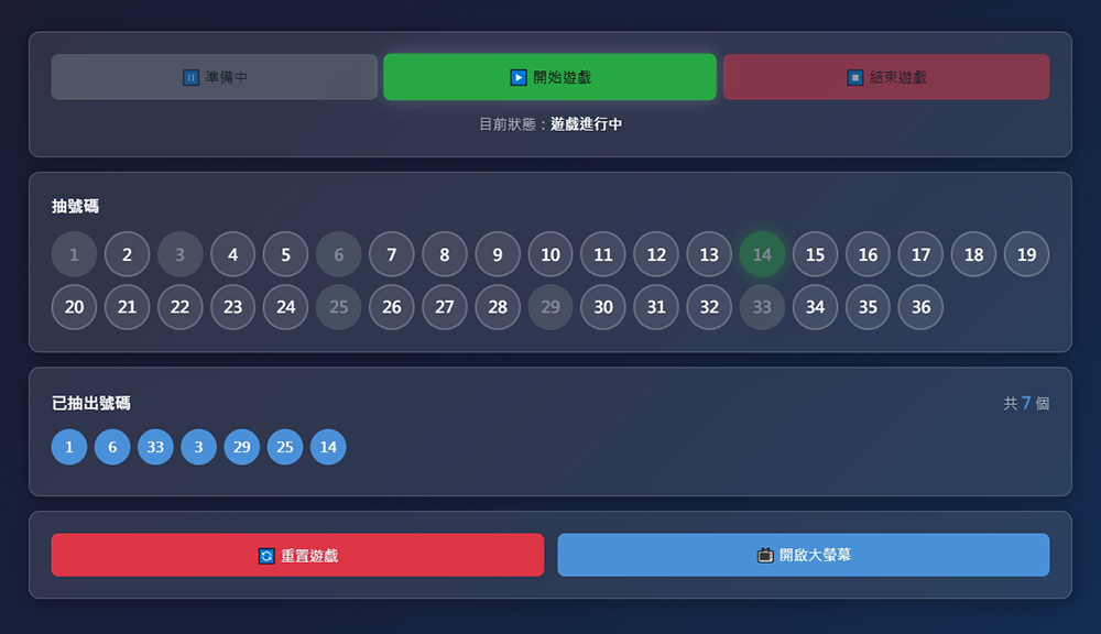 3.手機連線賓果&現場大螢幕顯示目前抽出號碼、連線排名
