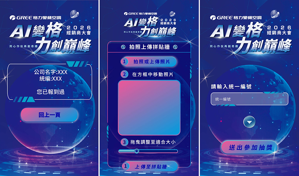 格力變頻空調2026經銷商大會600人QRCode報到系統+迎賓互動拍照上傳大螢幕輪播 同步抽獎資格+客製化抽獎畫面