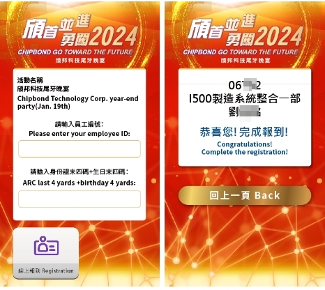 藍訊科技執行 頎邦科技尾牙盛宴 線上自行報到+客製化拉霸抽獎系統