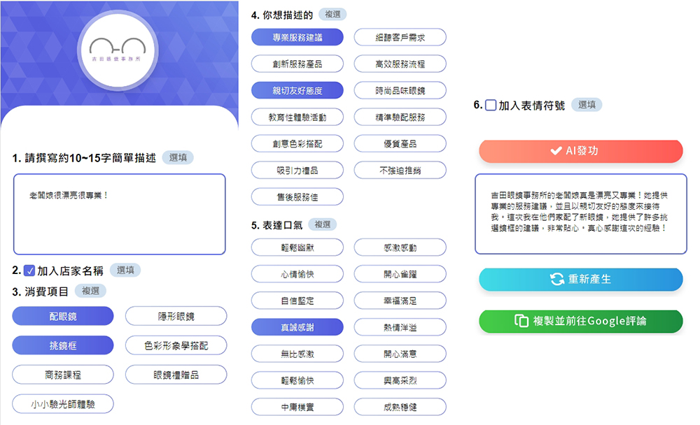 【中永和區眼鏡行-吉田眼鏡事務所】SEO行銷官網建置+AI寫作SEO行銷+快好評Google五星評論,提升品牌曝光率!