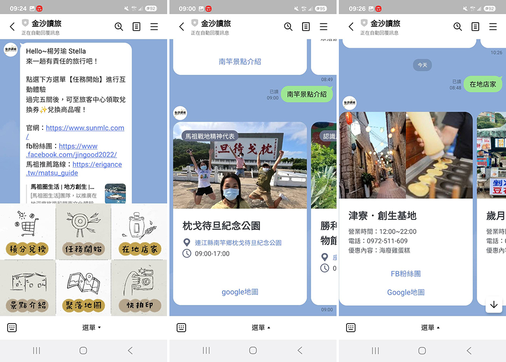 藍訊科技為「金沙讀旅」量身打造的 LINE 官方帳號,如同九九峰動物樂園的成功經驗,全面整合資訊傳遞、互動體驗與客戶服務。當您加入好友,將收到貼心的歡迎訊息,引導您透過LINE圖文選單輕鬆展開旅程,例如點擊「任務開始」進行 QR Code 闖關集點,或透過「景點介紹」瀏覽多頁訊息了解馬祖各地的豐富故事(包含Google地圖導航)。此外,帳號還提供AR互動拍照、積分兌換等功能,讓旅客不僅能輕鬆掌握最新資訊,更能享受深度互動的便利與樂趣,共同開啟金沙聚落的數位轉型新篇章。