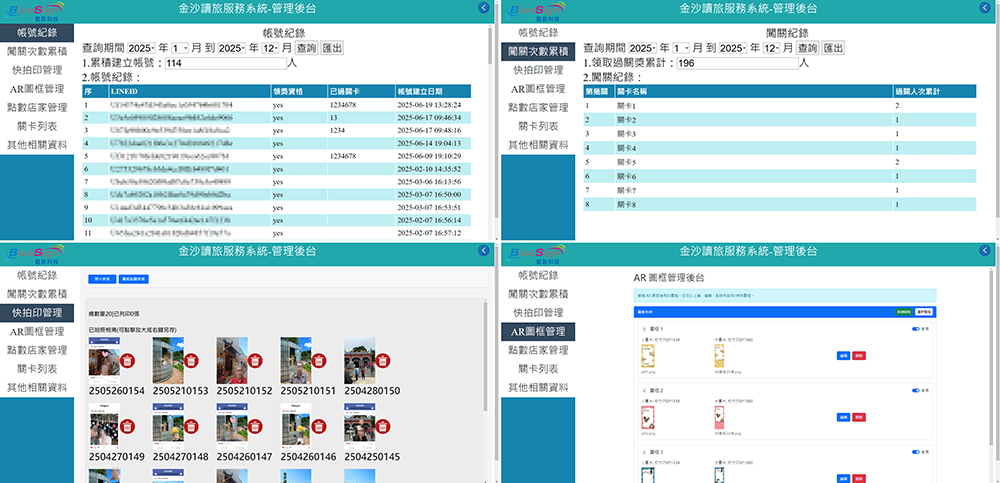 提供全面的數據洞察與便捷的操作功能。管理者可輕鬆查詢帳號與闖關紀錄,掌握活動參與度;視覺化管理快拍印出的照片與AR互動圖框,確保內容即時更新;同時也能彈性設定關卡、管理特約店家的點數核銷,全面提升營運效率,為「金沙讀旅」的數位轉型與服務優化奠定堅實基礎。