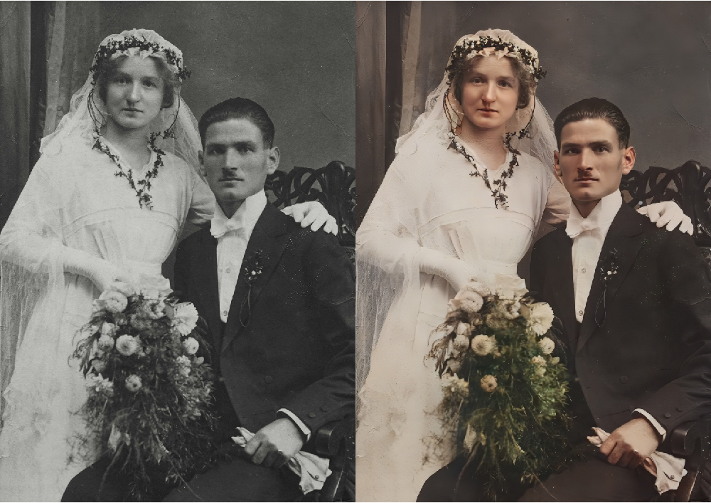 透過 AI上色技術,自動識別人物膚色、衣著、環境光線,自然還原出符合時代背景的色調,讓老照片重現生命力。
