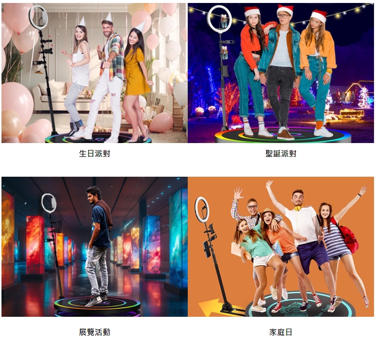 - 婚禮/求婚派對 —— 將人生最重要的時刻,以360°環繞拍攝技術完美定格。為新人與賓客提供一個充滿趣味拍照的互動區,記錄下浪漫與歡樂的每個瞬間,讓婚禮回憶動起來!